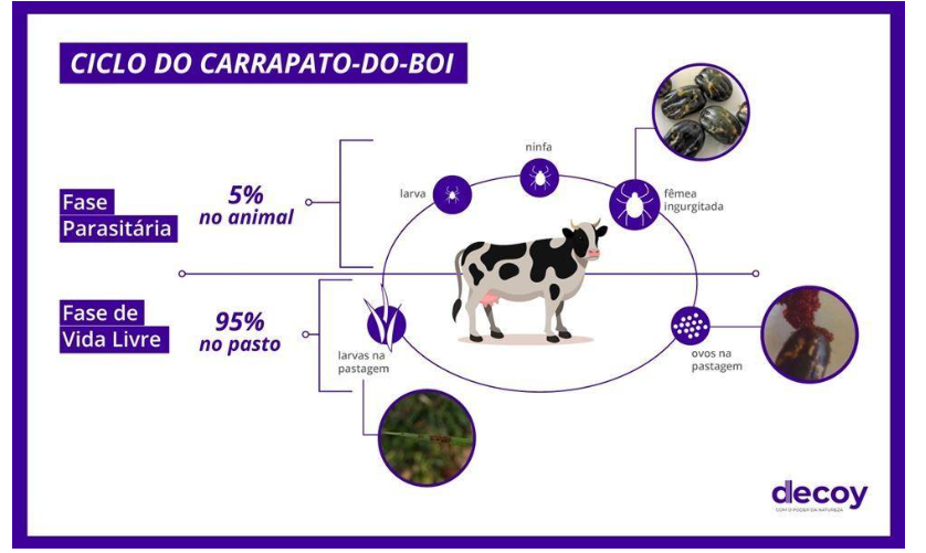 Se inicia quando a fêmea do carrapato fecundada e ingurgitada (repleta de sangue, necessário para maturação dos ovos) se desprende do animal (hospedeiro) e cai no pasto. Neste momento a fêmea entra na fase “pré-postura”, ou seja, fase anterior a liberação dos ovos, que dura cerca de 2 a 5 dias. É neste período que ocorre a produção e maturação dos ovos. Após, a fêmea inicia a postura dos ovos, que dura em média um período de 17 dias. Uma fêmea pode colocar o impressionante número de 3.000 mil ovos, o que explica o porquê de a grande maioria dos carrapatos estar no solo e não no animal. Desses ovos emergem os “micuins”, nome popular dado às larvas do carrapato. Também são conhecidas como larvas infestantes, e apresentam uma coloração avermelhada bastante característica. Para se desenvolverem, as larvas precisam de um hospedeiro, por isso, se agrupam nas pontas das folhas da pastagem e esperam algum animal passar. Quando isto ocorre, se fixam no hospedeiro e estão prontas para iniciar a nova fase de vida. E é assim que os carrapatos infestam seu rebanho!