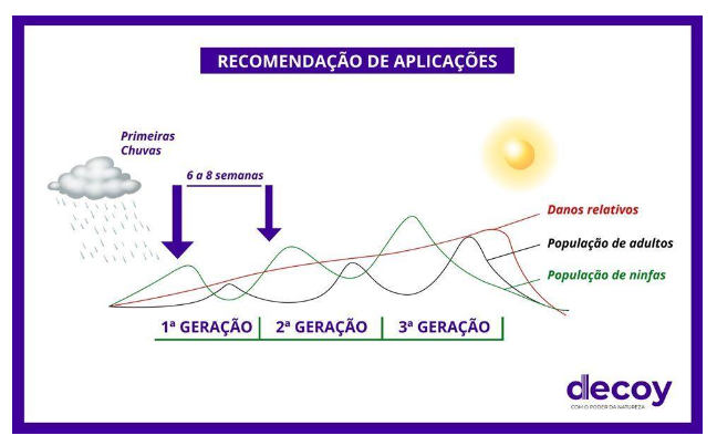 Para que haja um controle eficiente dessa praga, realizar aplicações no momento correto é fundamental. E qual seria este momento? Para que aplicações sejam feitas no momento certo e os resultados sejam eficazes é muito importante entendermos o ciclo de vida deste inseto-praga, e assim, conseguirmos realizar um controle biológico estratégico. De maneira geral, as primeiras aplicações para controle dessas pragas deve ser feita logo que o produtor perceber a presença das primeiras cigarrinhas adultas. Como as cigarrinhas necessitam de umidade mais alta para o seu desenvolvimento, este surgimento das primeiras cigarrinhas adultas deve ocorrer logo após as primeiras chuvas. O produtor deve ficar muito atento quanto a necessidade de mais aplicações, que devem ocorrer de acordo com o ciclo da praga. Essa segunda aplicação impede a terceira e maior onda de infestação das cigarrinhas, garantindo um controle eficiente dessas pragas.